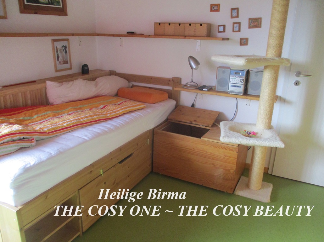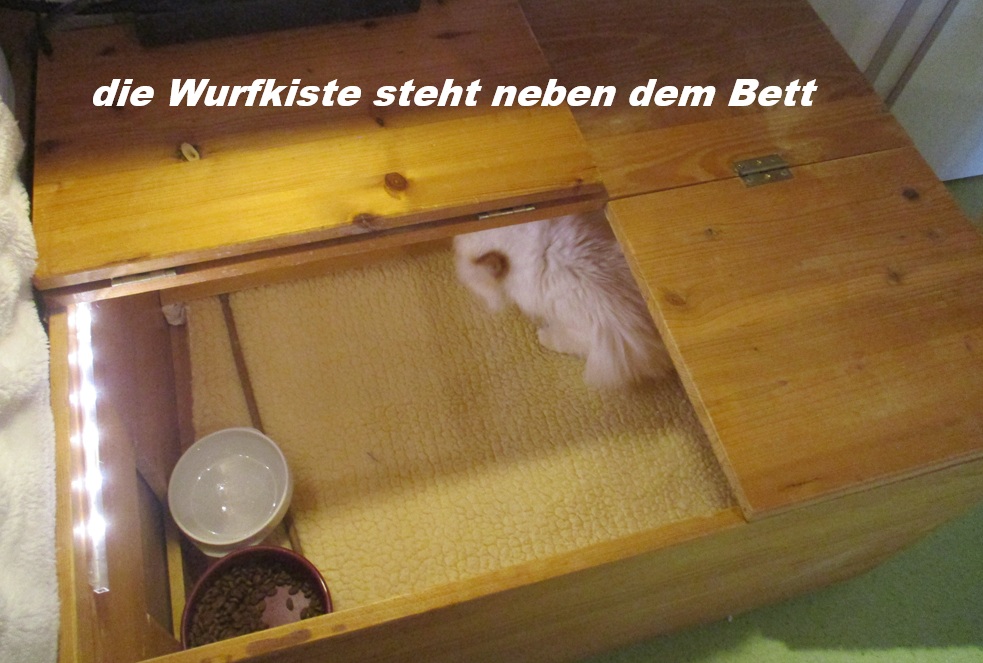 neben der Wurfkiste steht ein Bett, hier schlafe ich die Tage vor und nach der Geburt um immer bei der werdenden Mama zu sein :)