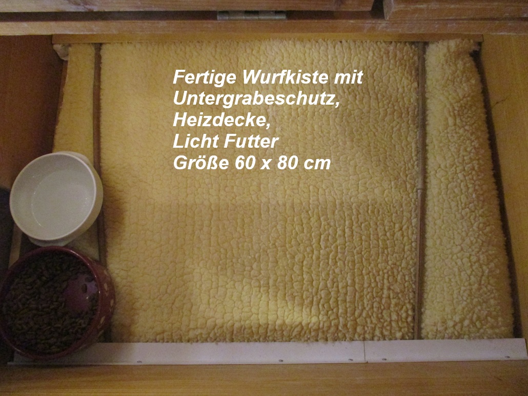 Unser Wurfkiste ist ausgestattet: mit Licht, Heizdecke, Untergrabeschutz und Material zum Nestbau